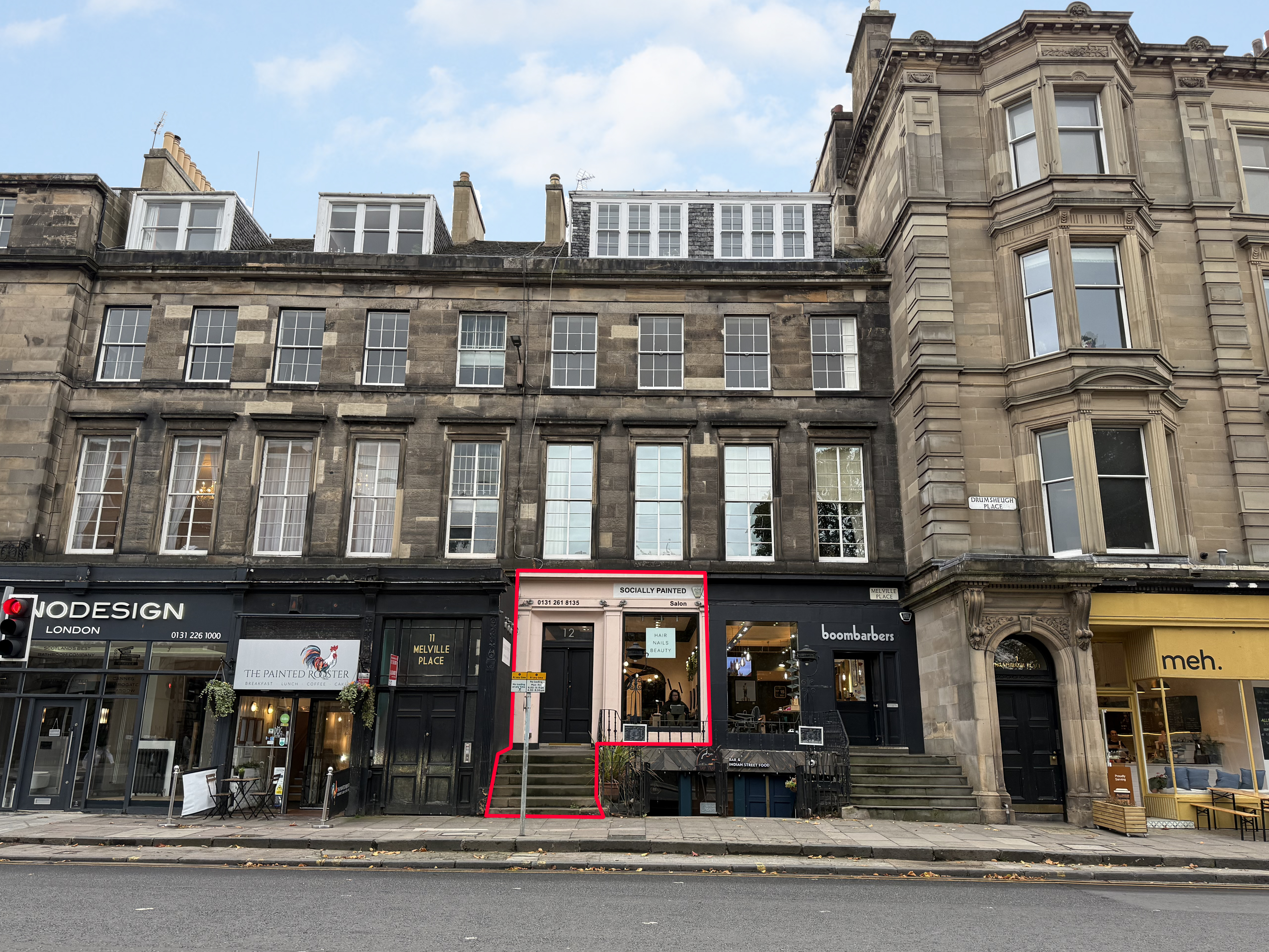Melville Place is in the heart of Edinburgh’s West End, approximately 350 metres from the west end of Princes Street. It is a busy arterial route leading into the city centre. It benefits from a strong commercial and office catchment and serves the affluent residential neighbourhoods of the New Town, Stockbridge, and Dean Village. The subjects occupy a prominent position on the West side of Melville Place, beside Drumsheugh Place and opposite Randolph Crescent. Nearby occupiers include Boombarbers, Direct Lettings, ESPC, Cairngorm Coffee and The Painted Rooster.